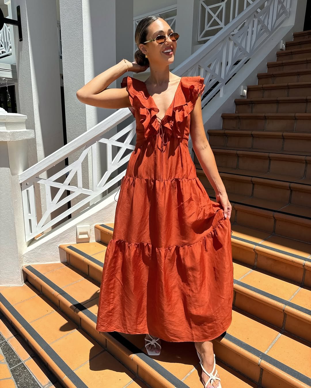 Terracotta tones always remind me of sun-soaked villas and clay-tiled rooftops. This tiered maxi captures that exact mood with its warm color and soft ruffle details that add movement without feeling overdone.
