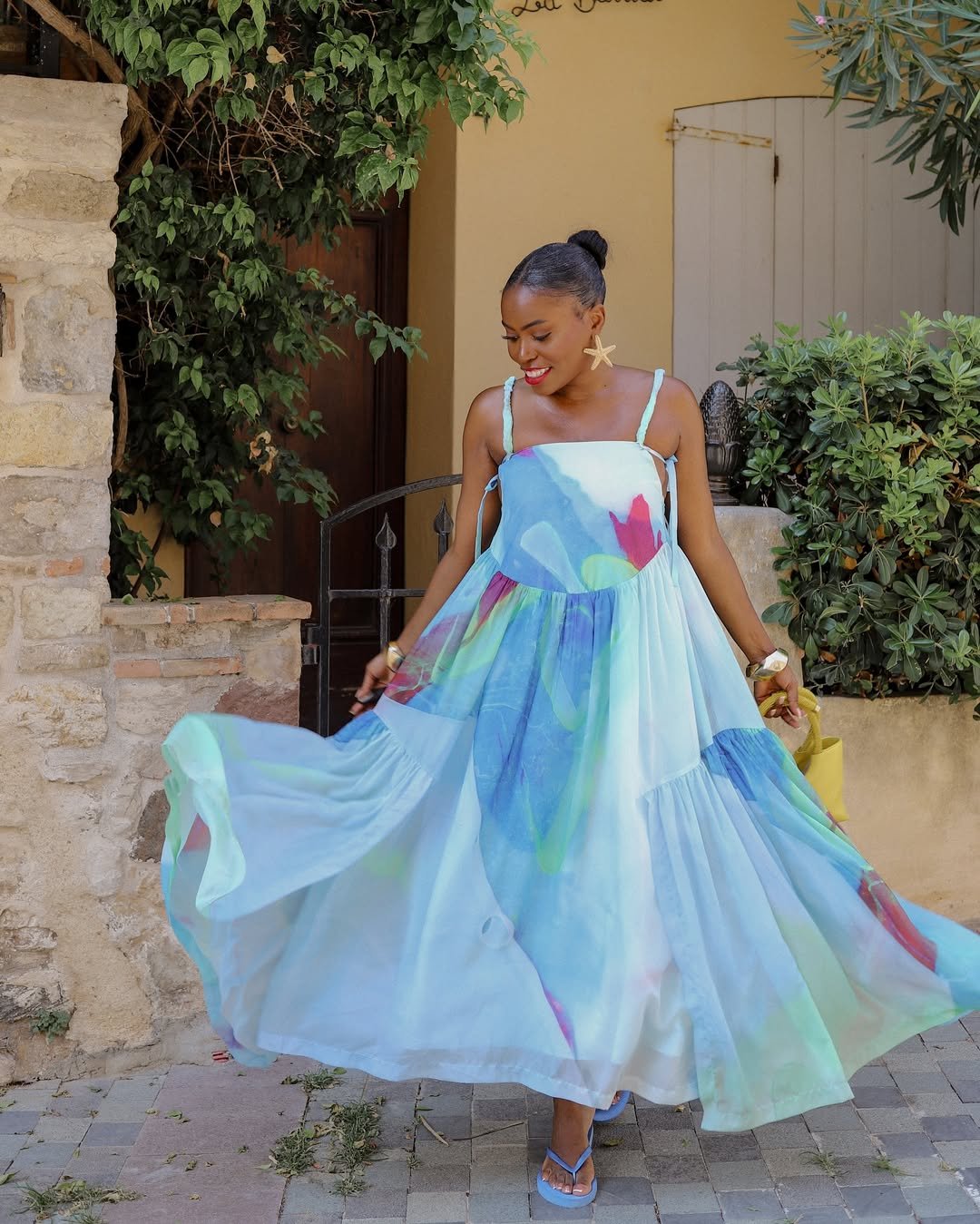 This one moves like a watercolor painting in motion. The dreamy wash of blues, greens, and soft pastel hues gives the dress a light, airy presence that almost floats when you walk. It feels artistic and carefree, perfect for warm afternoons exploring a Mediterranean village.