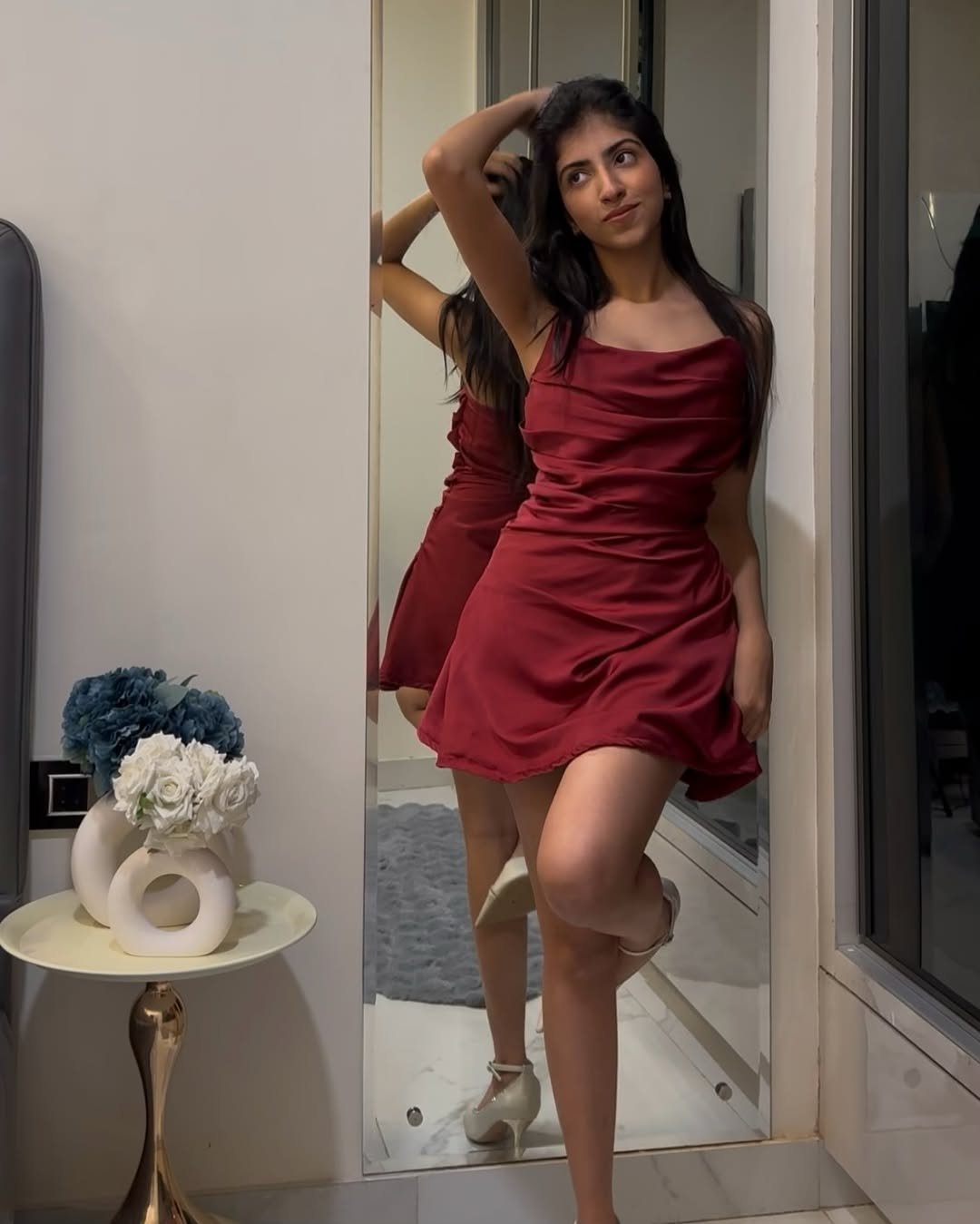 Styled with delicate heels and that relaxed, carefree pose, it feels like the perfect dress for a cozy Valentine’s at home, a cute date night, or even a solo self-love celebration.