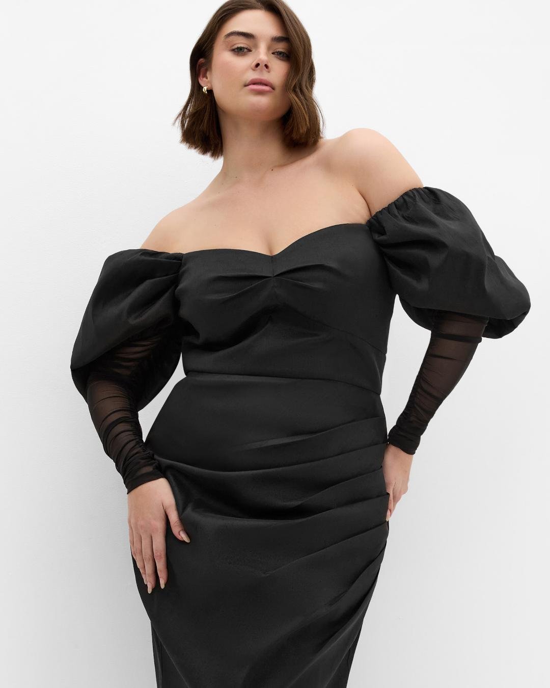 This off-shoulder black gown brings a sultry twist to Valentine’s dressing. The structured bodice paired with sheer sleeves feels modern and confident, almost cinematic in the way it holds the light.
