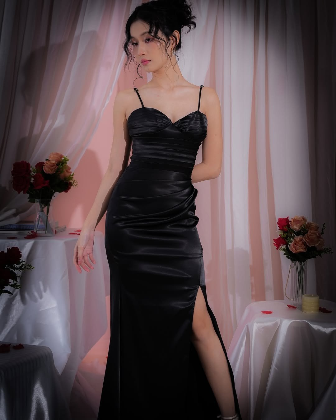 A glossy black gown with a thigh-high slit — this one is pure cinematic energy. The satin drapes beautifully across the bodice, creating that sculpted, almost-liquid look that photographs like a dream.