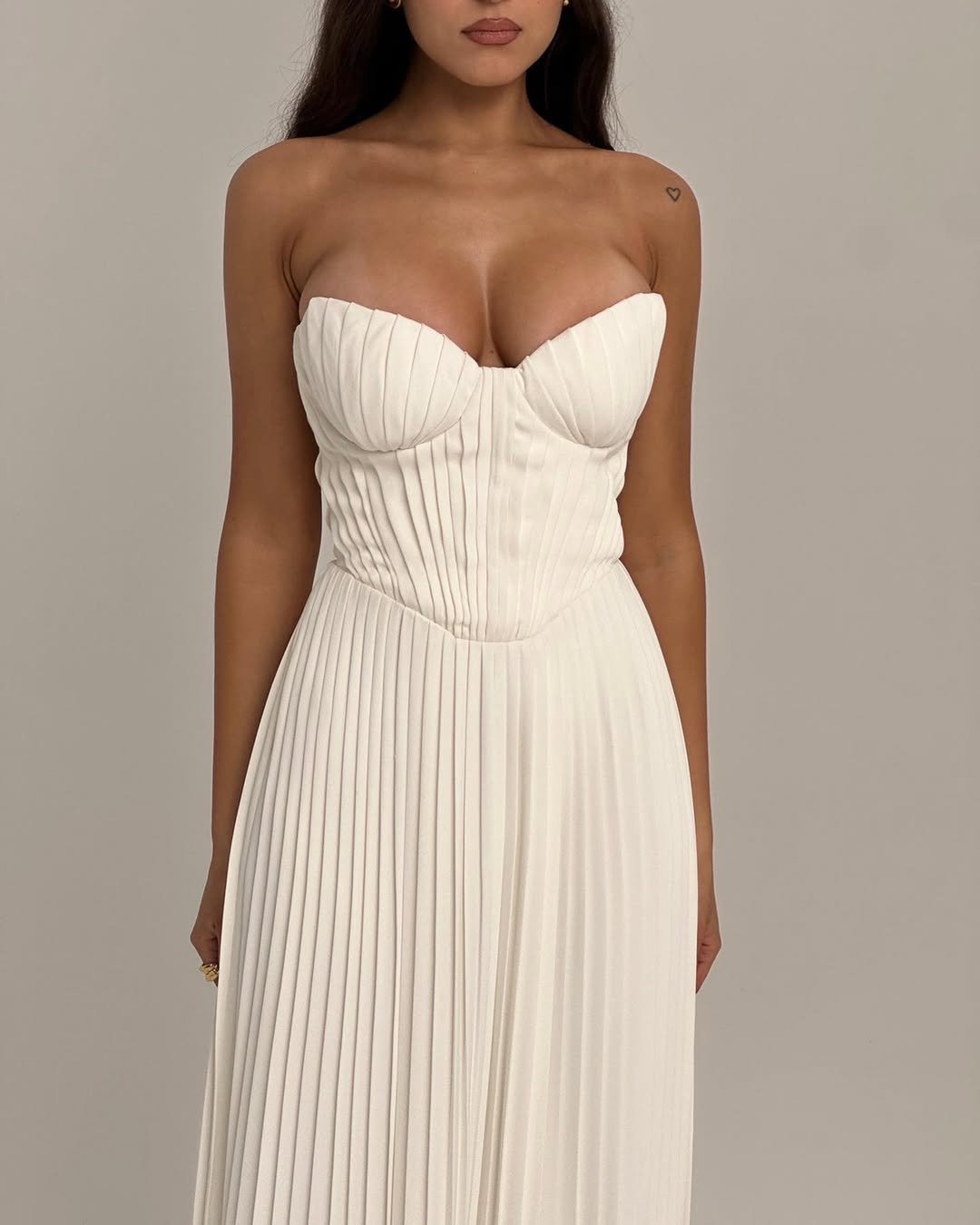 This ivory pleated gown brings a fresh, goddess-like energy to Valentine’s dressing. The structured, corset-inspired bodice paired with those elongated, delicate pleats creates a look that’s refined yet subtly sensual.