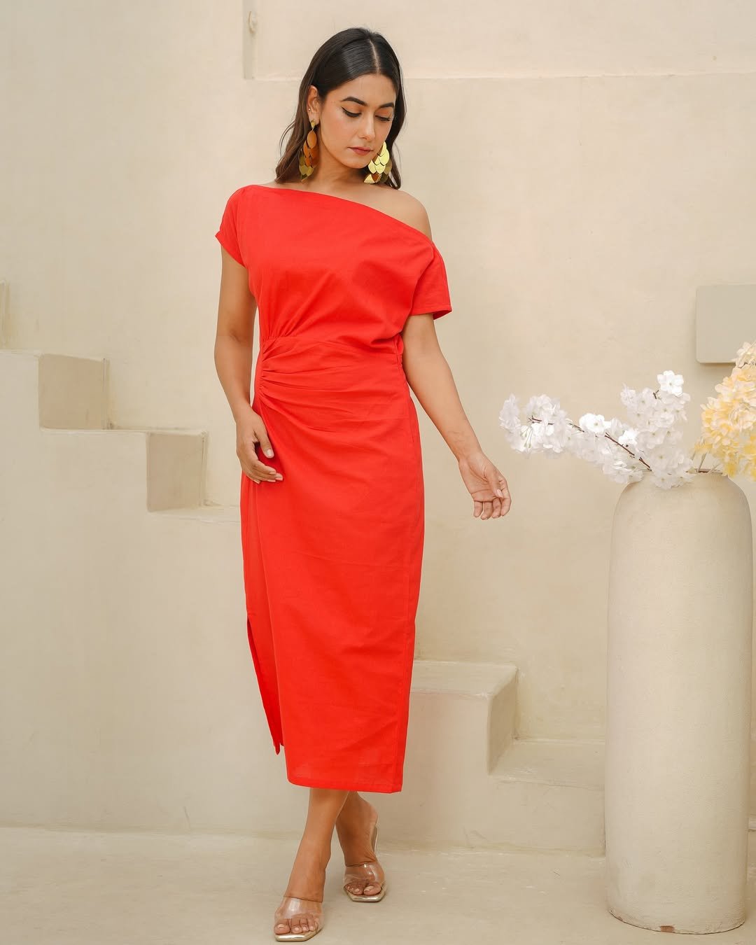 This one-shoulder scarlet dress brings a lovely effortless charm. The draped waist adds natural softness, while the clean lines keep everything modern and chic. It’s simple, but in that “I know exactly what works for me” kind of way.