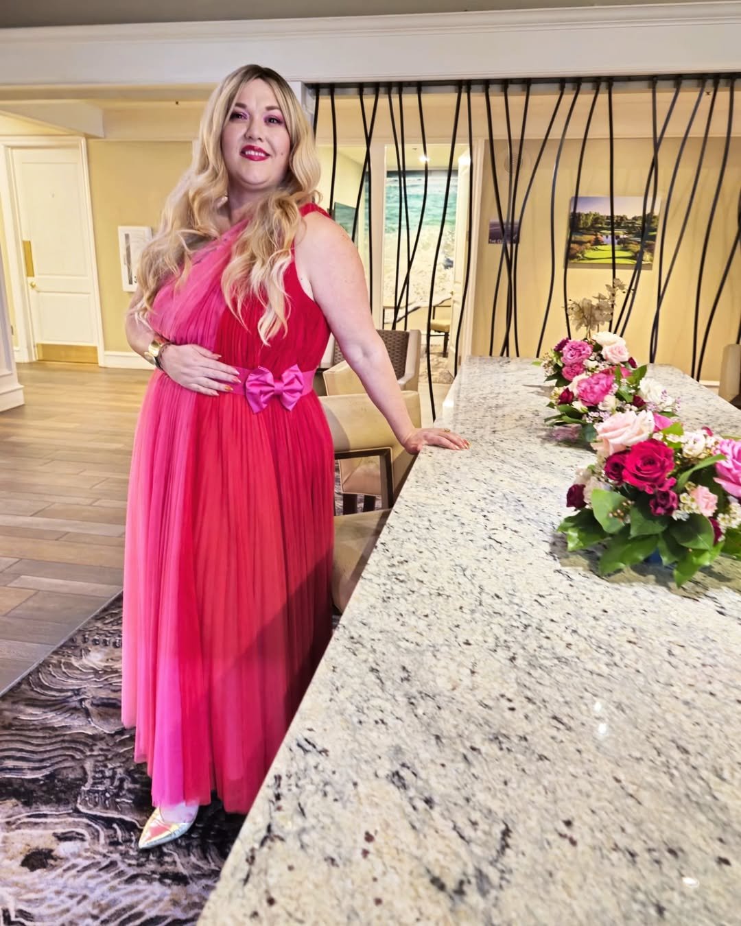 A gradient of reds and pinks gives this pleated gown the sweetest Valentine’s charm. The bow detail at the waist adds just the right amount of whimsy, tying the whole look together with a soft, feminine touch.
