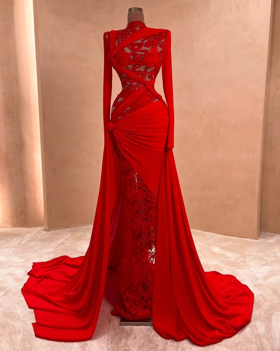 This gown is drama in its most elegant form. The sculpted lace bodice, the wrapped detailing, the draped skirt—every inch looks meticulously crafted to hug curves and command a room without ever shouting. It’s giving “Valentine’s Day but make it museum-level art,” and honestly, it’s the kind of dress that makes you stand taller the moment you step into it.