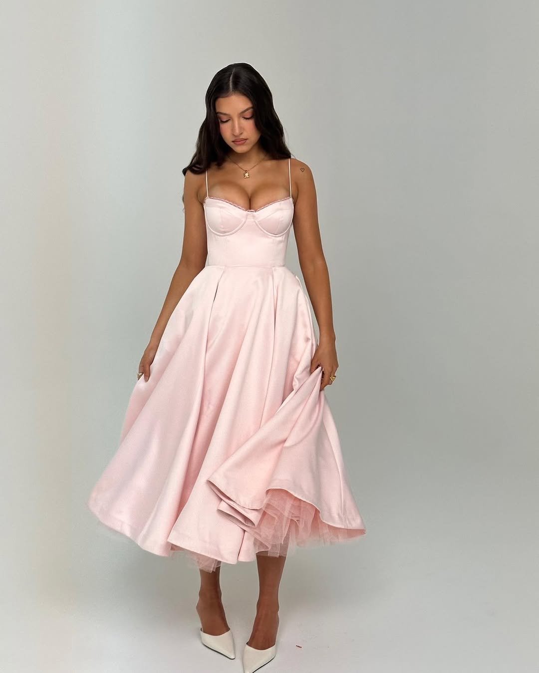 This dress feels like stepping into a modern-day fairytale — a soft blush pink, structured bodice, and a voluminous tea-length skirt that moves with that dreamy, floaty elegance. It’s equal parts vintage and modern, the kind of silhouette that makes you want to spin just to feel the fabric sway.