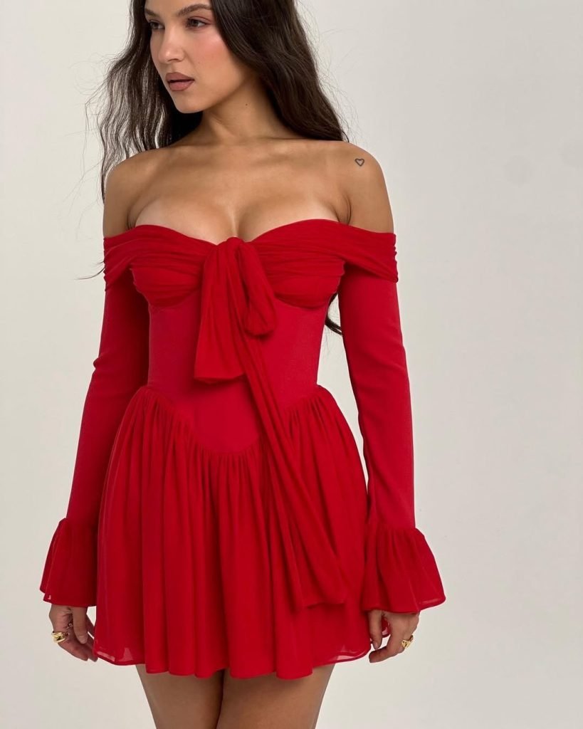 This off-the-shoulder red mini with its oversized front bow is pure Valentine’s fantasy — structured yet soft, flirty yet glamorous. The chiffon sleeves and gathered skirt add movement and charm.