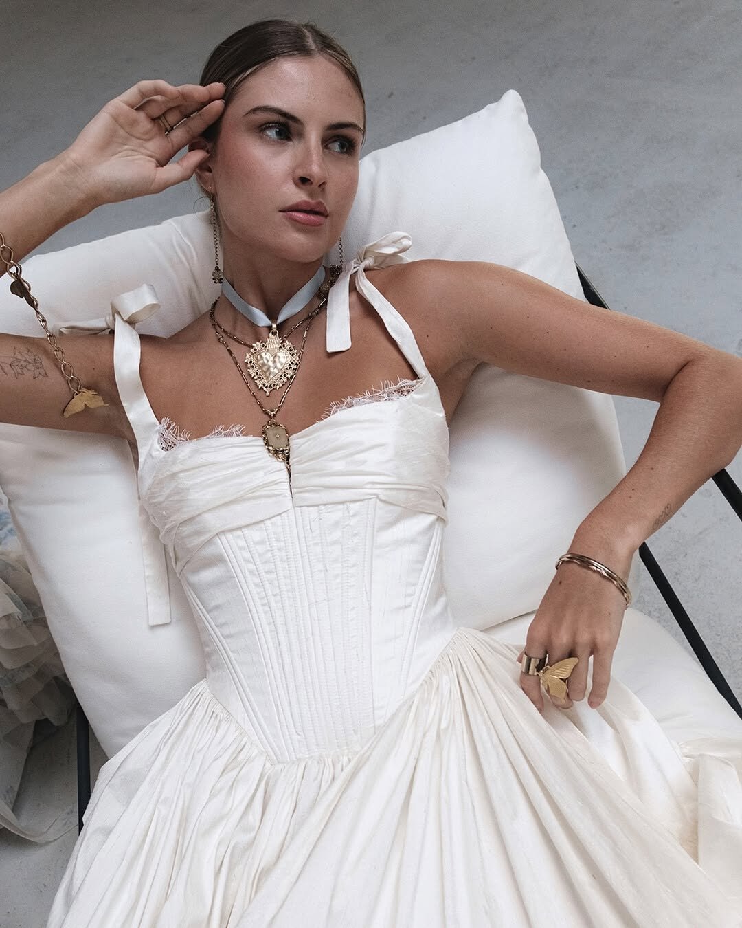 This corseted ivory dress is straight out of a storybook, with its soft lace details, ribbon straps, and artful gathering at the waist. It feels both old-world and fresh, like something you’d wear for a beautifully intimate Valentine’s celebration.