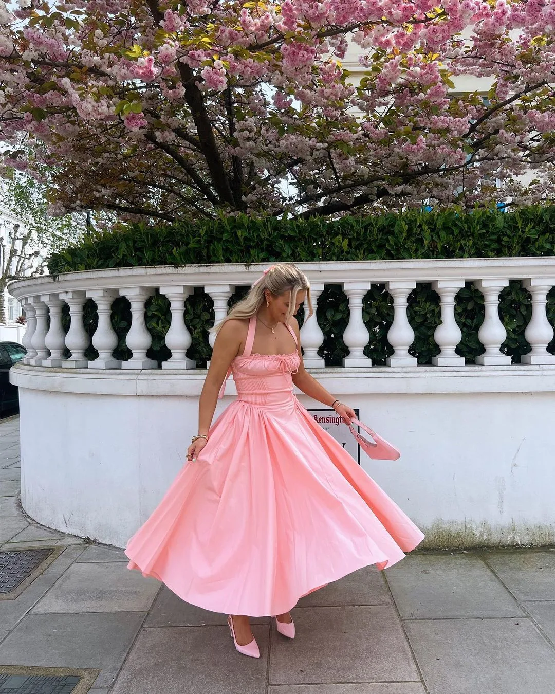 Nothing says romance quite like this dreamy pink halter dress floating in the breeze. It’s soft, whimsical, and made for twirling — the kind of dress that turns ordinary sidewalks into your own little runway.