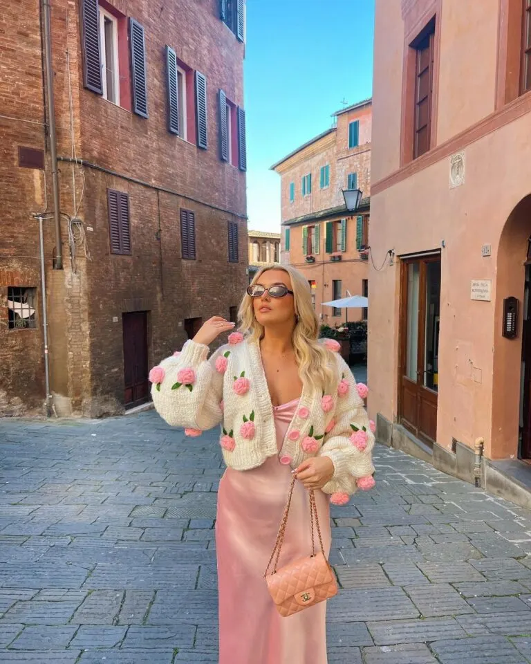 This look is pure Valentine’s sugar. A silky blush dress paired with the most adorable hand-knit cardigan, dotted with 3D roses — it’s giving cottage-core Valentine with a dash of luxury.