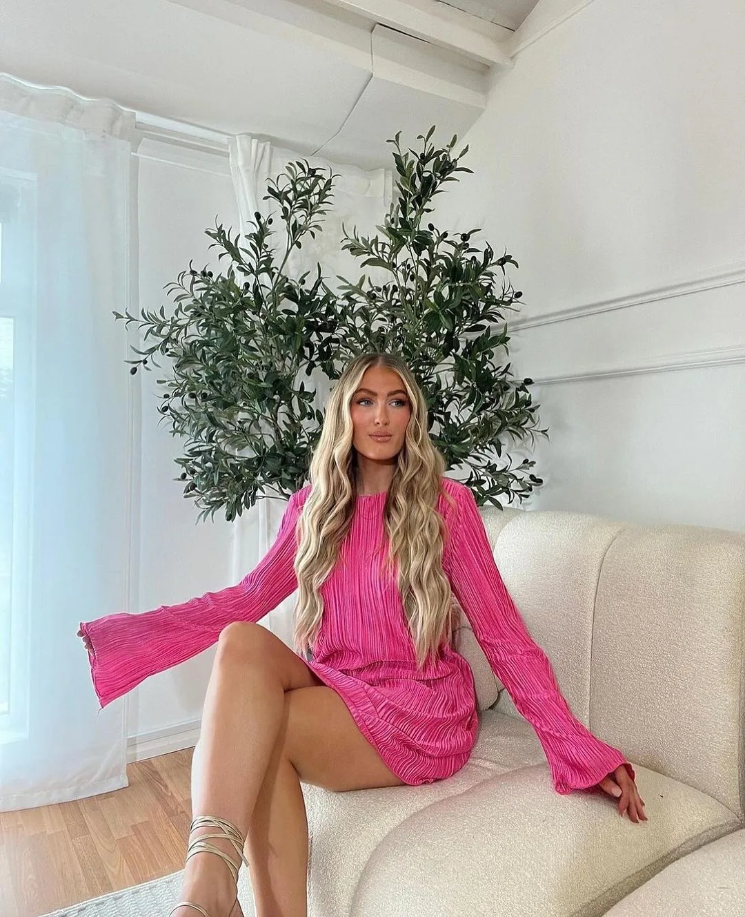 A hot-pink mini with pleats and dramatic sleeves? Say no more. This look radiates playful Valentine’s energy without losing its chic factor. It’s bright, fun, and guaranteed to stand out in any room.