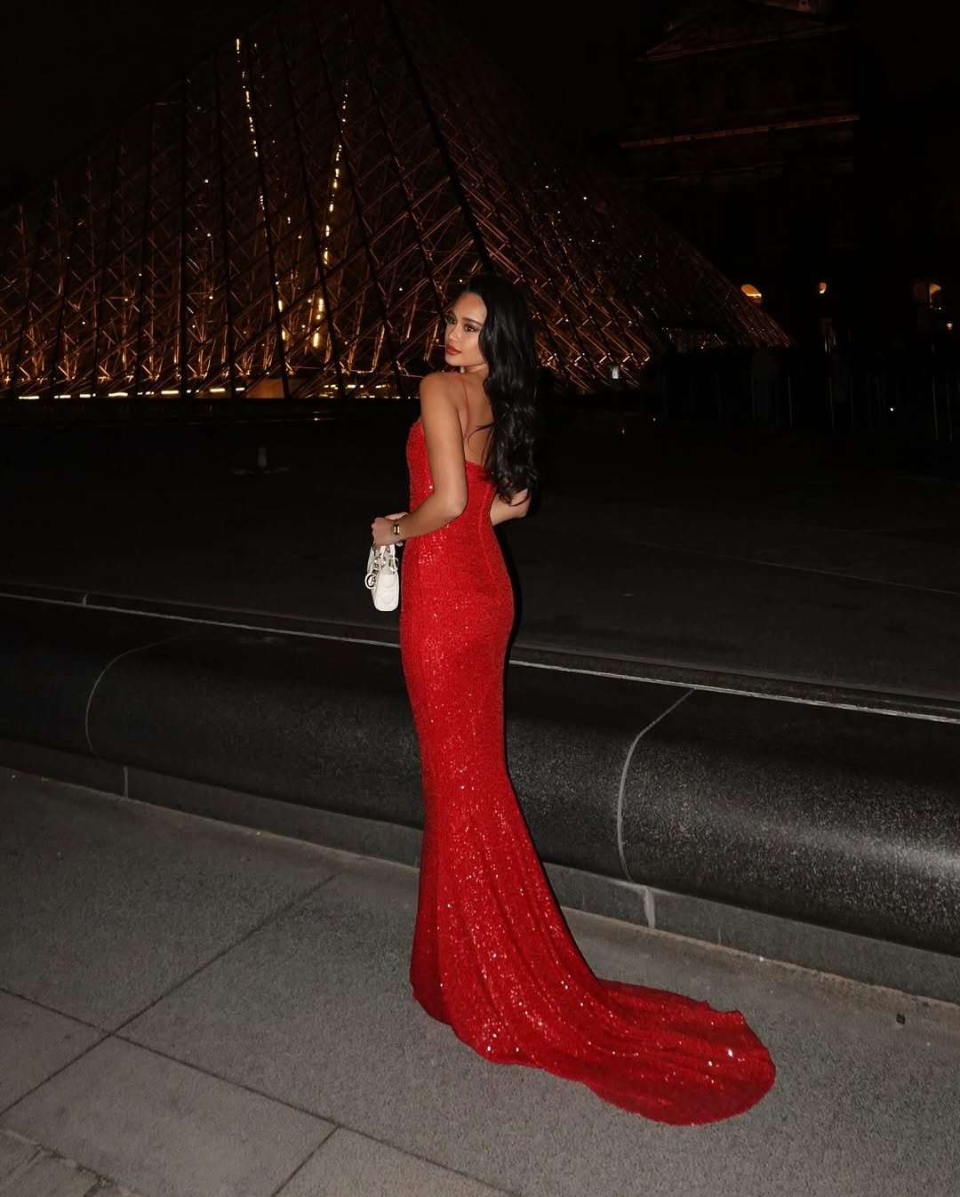 This is the definition of Hollywood Valentine fantasy. The long, glittering, mermaid-style gown hugs beautifully and then trails with the kind of drama candlelit dinners were invented for. And that backdrop? Chef’s kiss — like she stepped straight out of a dream sequence.