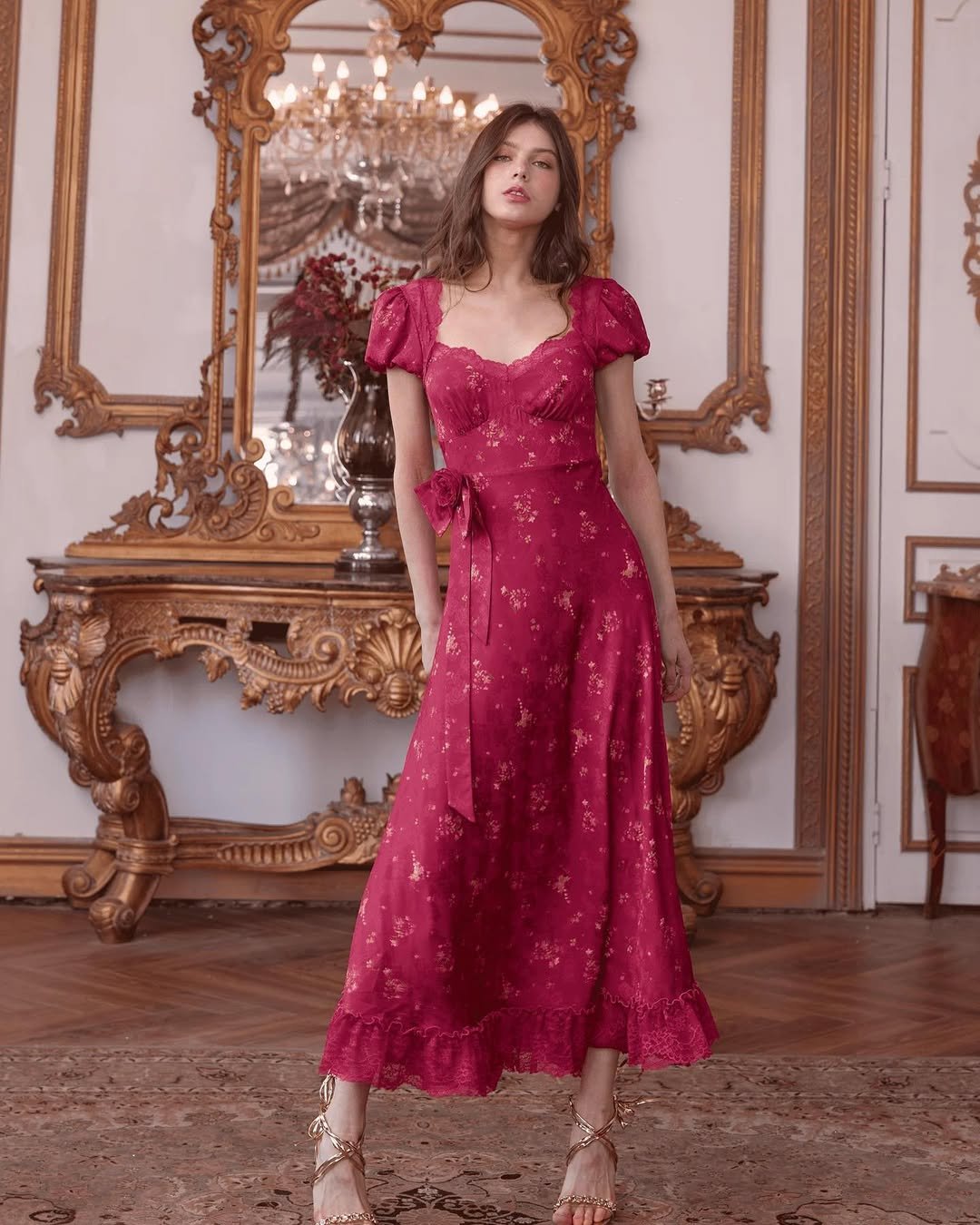 This red gown feels like it belongs in a gilded ballroom — the kind with chandeliers, violins, and secrets whispered behind fans. The subtle gold detailing elevates it from “pretty dress” to “Valentine’s masterpiece,” while the puff sleeves keep that dreamy, vintage softness alive.