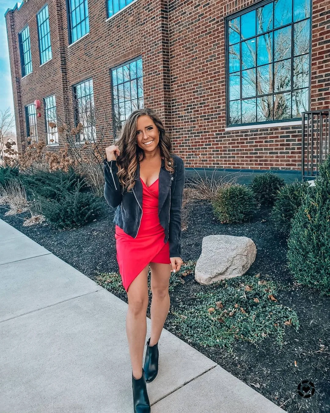 A red mini dress with a chic jacket instantly becomes the “I’m going out and I know I look good” outfit. The bold color pops against the cool cityscape, while the darker jacket adds a grounded, effortless vibe. It feels flirty but still real-life wearable — the perfect date-night formula.