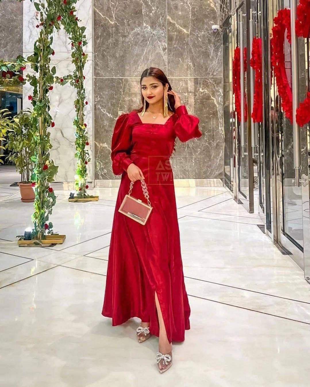 This rich red dress nails that classic Valentine’s vibe — dramatic sleeves, luxe fabric, and a sleek silhouette that turns heads without even trying. The thigh-slit adds just the right amount of sass, while the soft shine keeps it elegant.