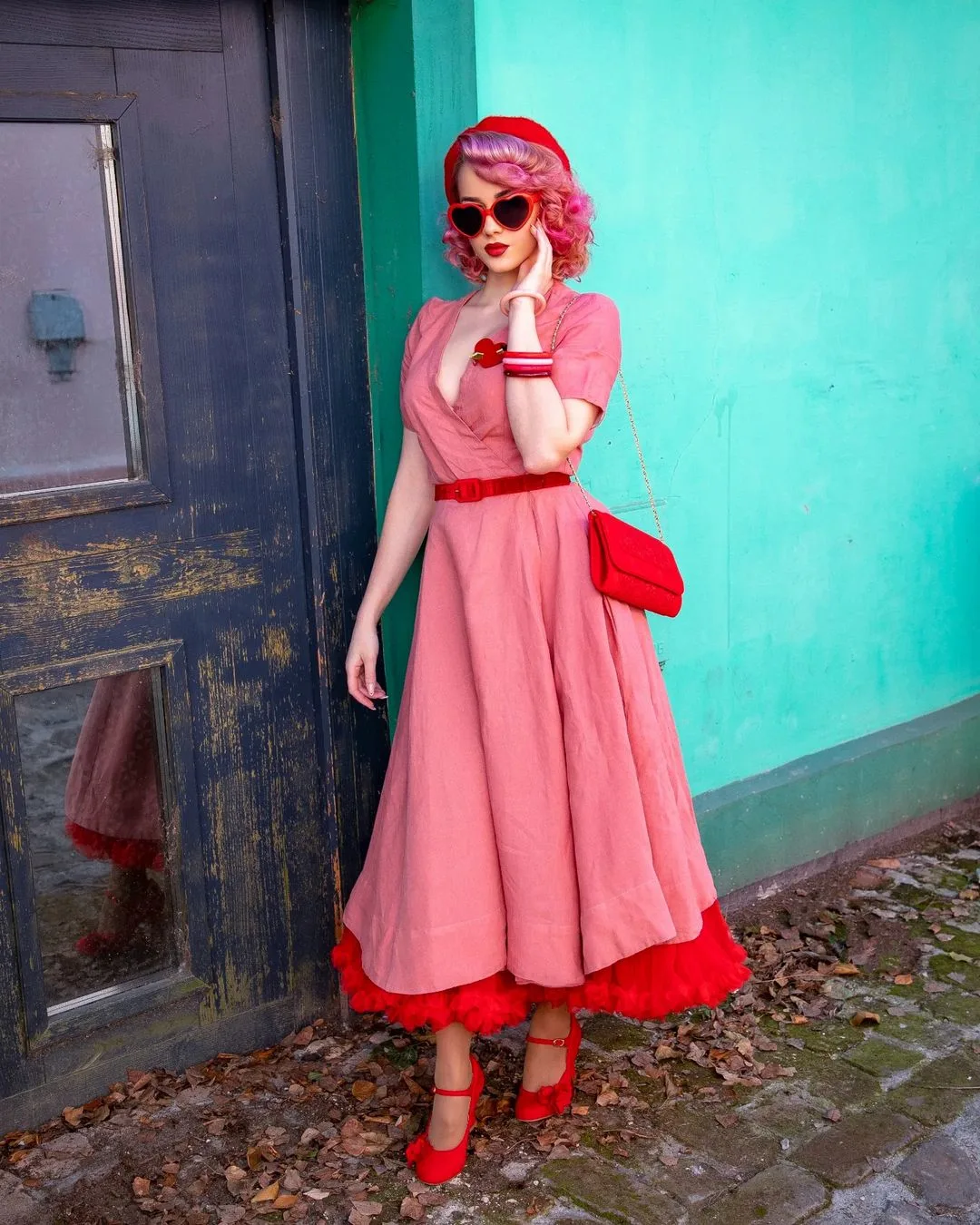 This look is such a vibe — a perfect blend of retro romance and modern confidence. The soft pink meets bold red, creating that classic Valentine’s palette with just a hint of playful drama. And those heart-shaped glasses? Chef’s kiss.