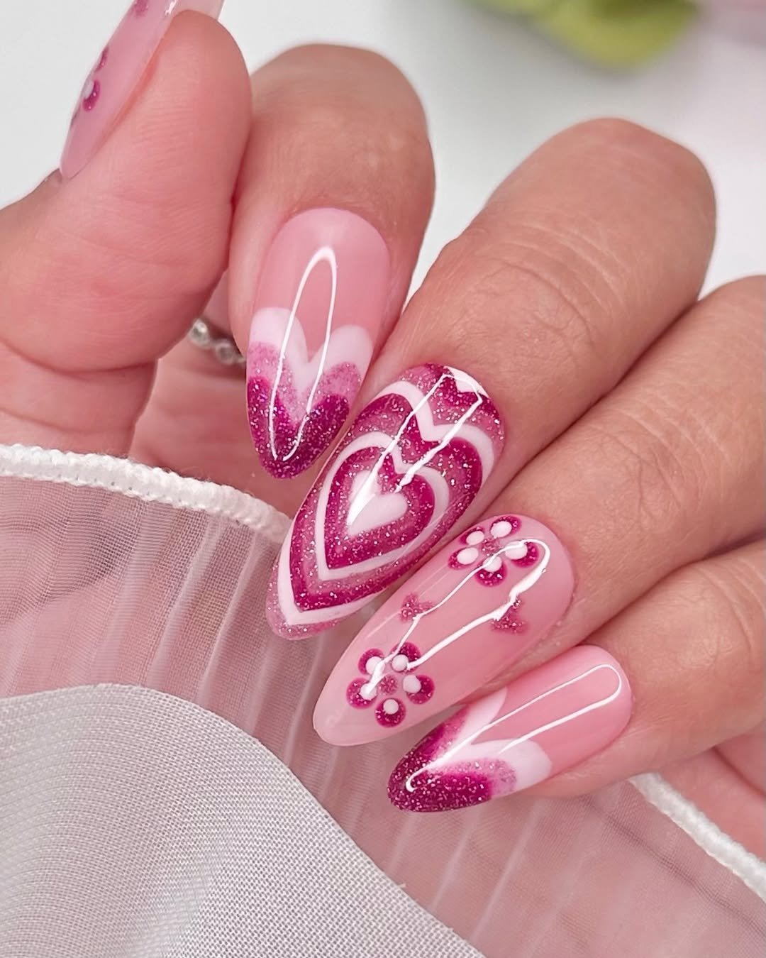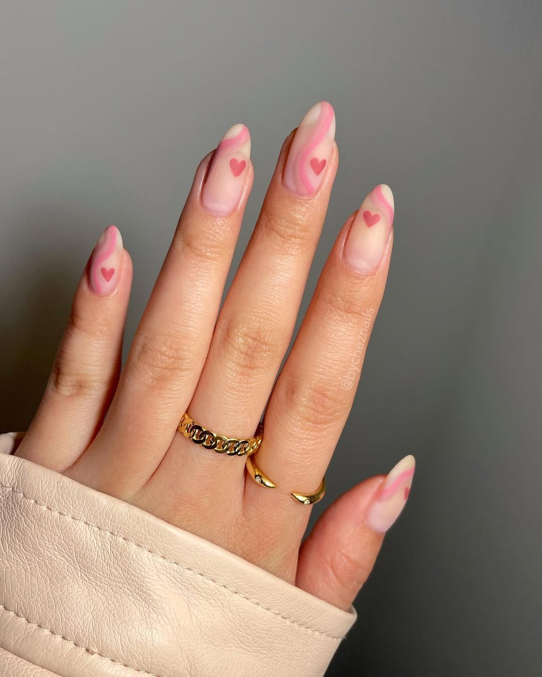A shimmery pink ribboning through each nail gives this design that dreamy, editorial touch — almost like watercolor candy. The tiny hearts tucked into the swirls are sweet without being overly literal, creating a mani that feels both festive and fashion-forward.