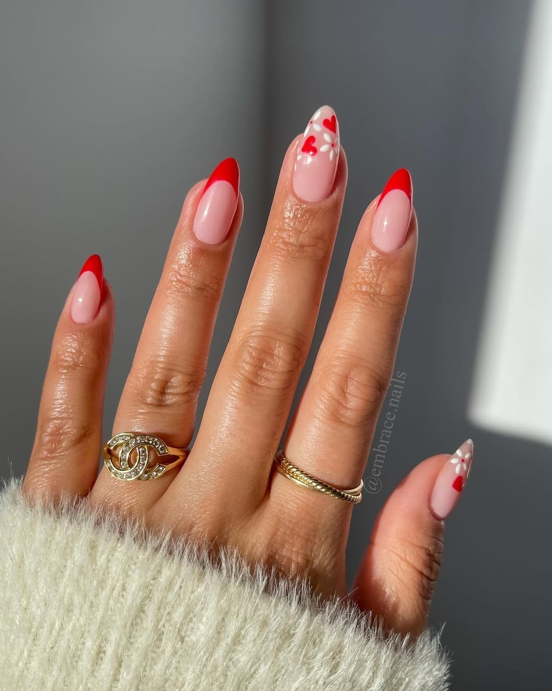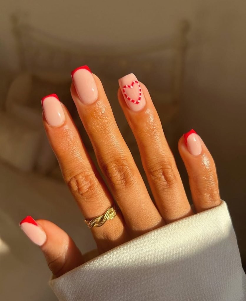 Classic red French tips get a Valentine’s twist with sweet heart-and-daisy accents on the feature nails. It’s equal parts chic and playful, with that crisp contrast between nude and red making the whole design feel fresh and modern.