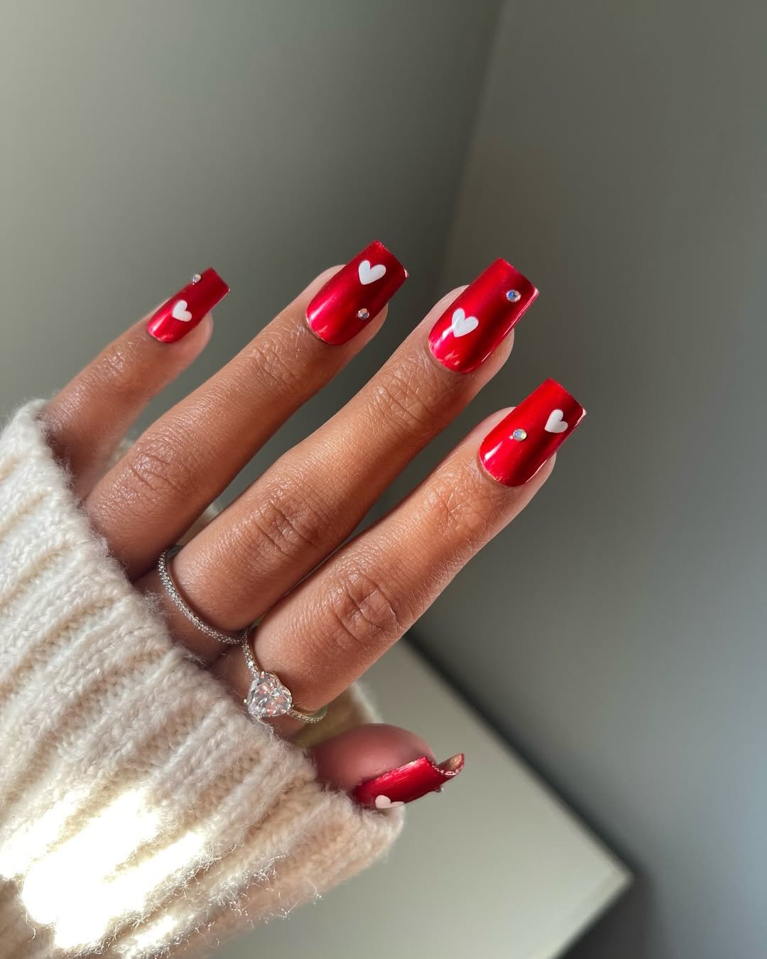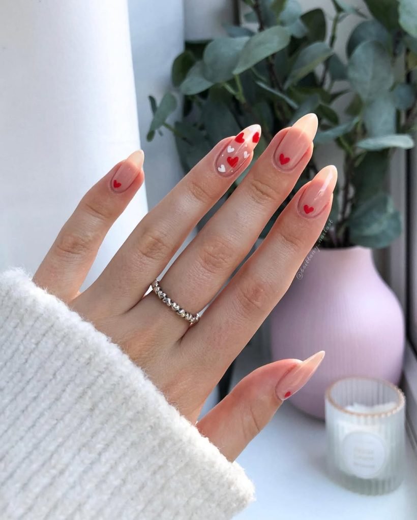 These delicate red and white hearts float across a nude base like confetti on a gentle breeze. The look feels quiet and cozy — imagine soft sweaters, a warm candle, and a weekend spent leaning into all things romantic.