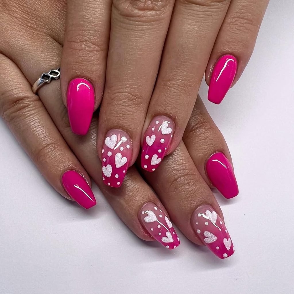 Vivid pink and fluttery white hearts come together in a look that feels like a Valentine’s card brought to life. It’s fun, bright, and a touch nostalgic — the kind of cheerful, candy-coated mani that instantly lifts your mood.