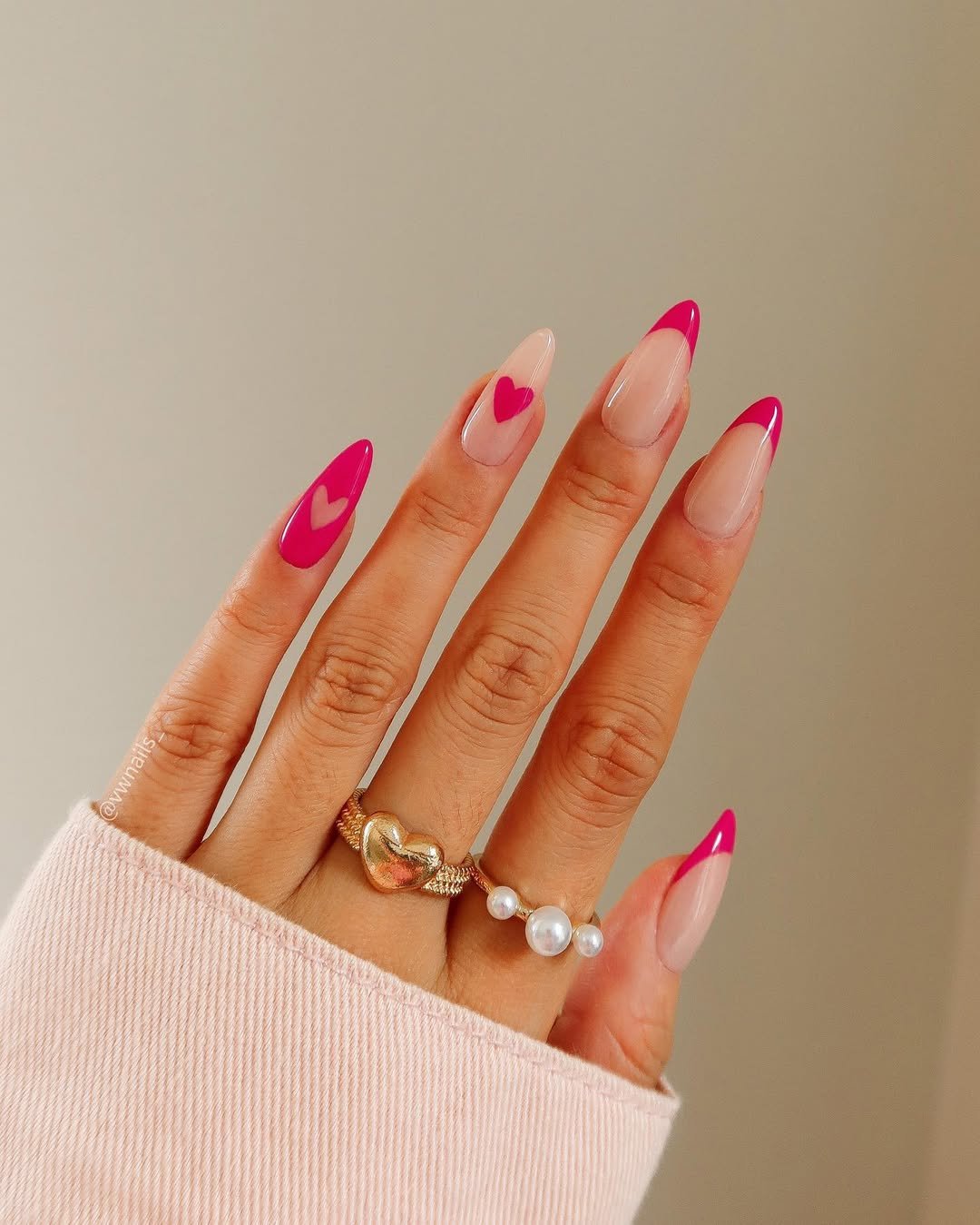 A vibrant pink French tip brings instant flirtiness, but it’s that perfectly centered heart on the accent nail that seals the deal. The almond shape softens the whole look, making the bold color feel chic rather than loud.