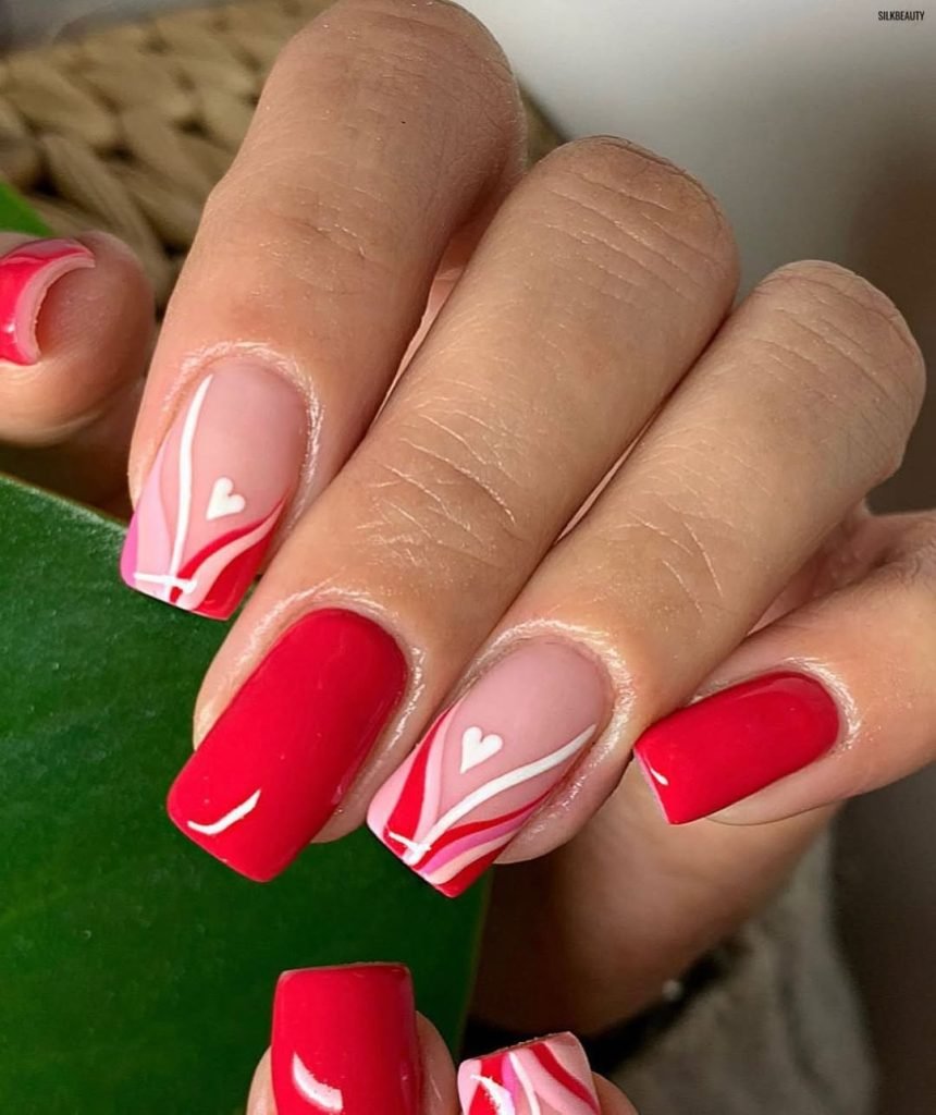 Soft, sweeping lines meet bold red polish for a design that feels floral-adjacent without being literal. The little white heart tucked into the abstract curves gives the whole look a romantic rhythm — like a breeze catching the hem of a dress.