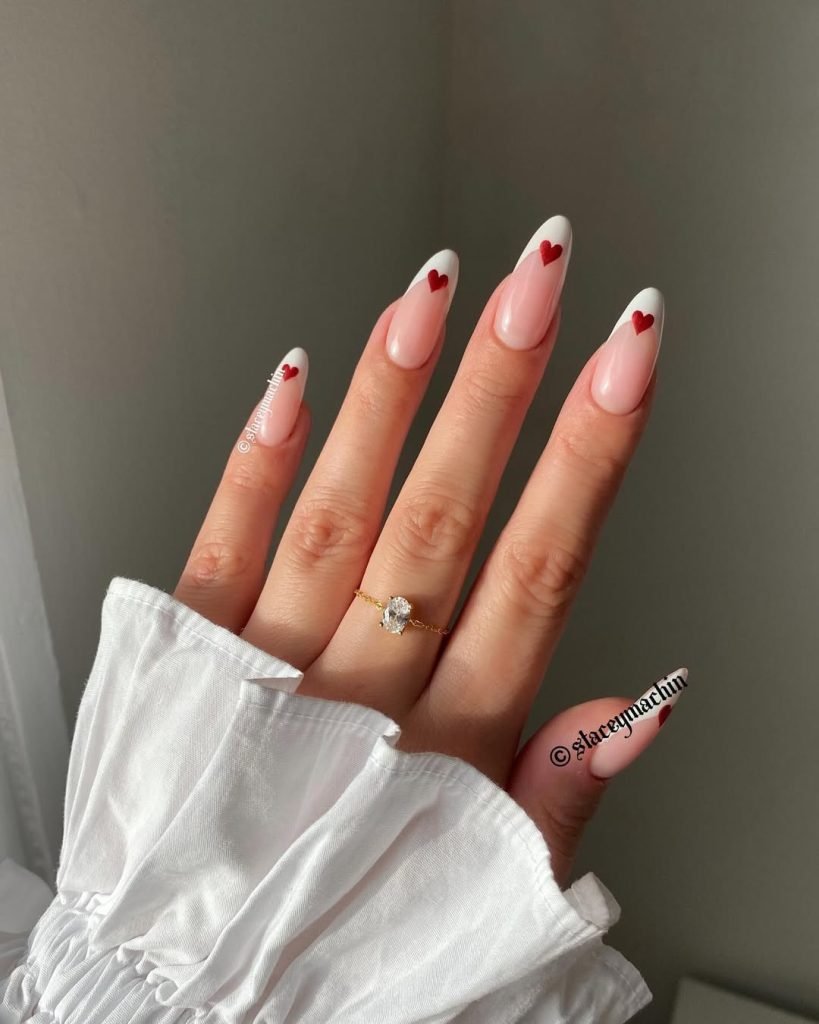 These white-tipped almond nails get a romantic upgrade with dainty red hearts placed right at the point of each French. It’s such a charming detail — simple, intentional, and incredibly chic.