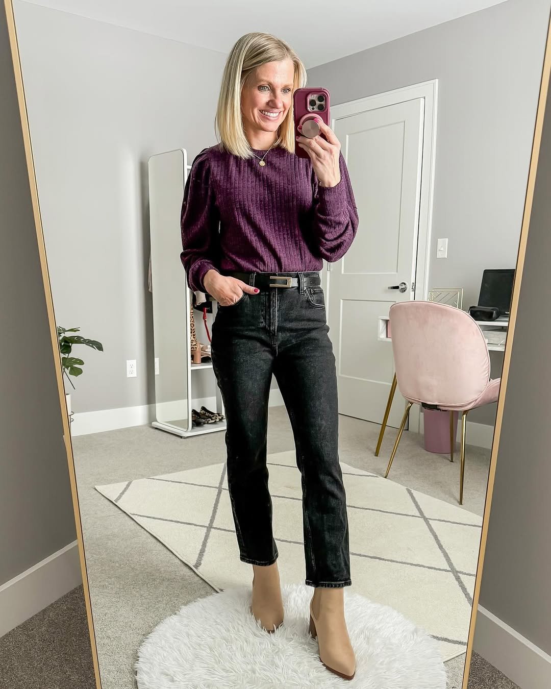 This outfit feels refreshingly real. A rich berry-toned top paired with dark denim makes for an effortless Valentine’s look that still feels thoughtful. It’s relaxed but polished, cozy but put-together.