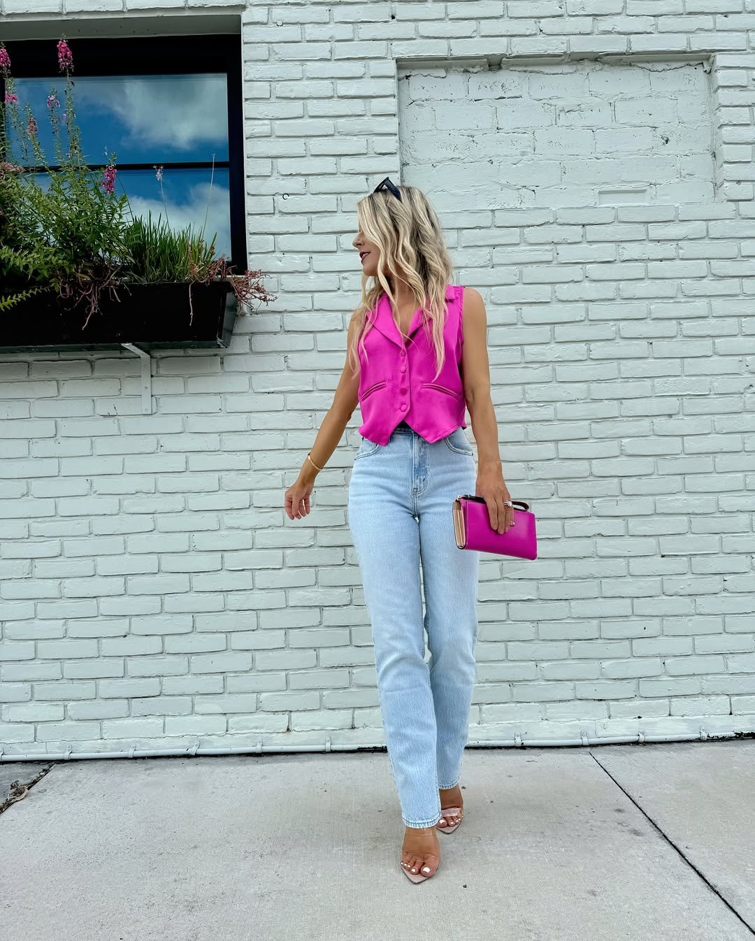 Tailored but fun, this pink blazer moment strikes the perfect balance between polished and playful. Paired with denim, it feels modern and approachable, not overly dressed.