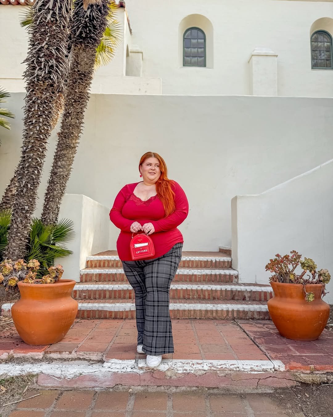 This deep red top paired with plaid pants feels grounded and timeless. The color story is rich without being overwhelming, striking a perfect balance between festive and wearable.