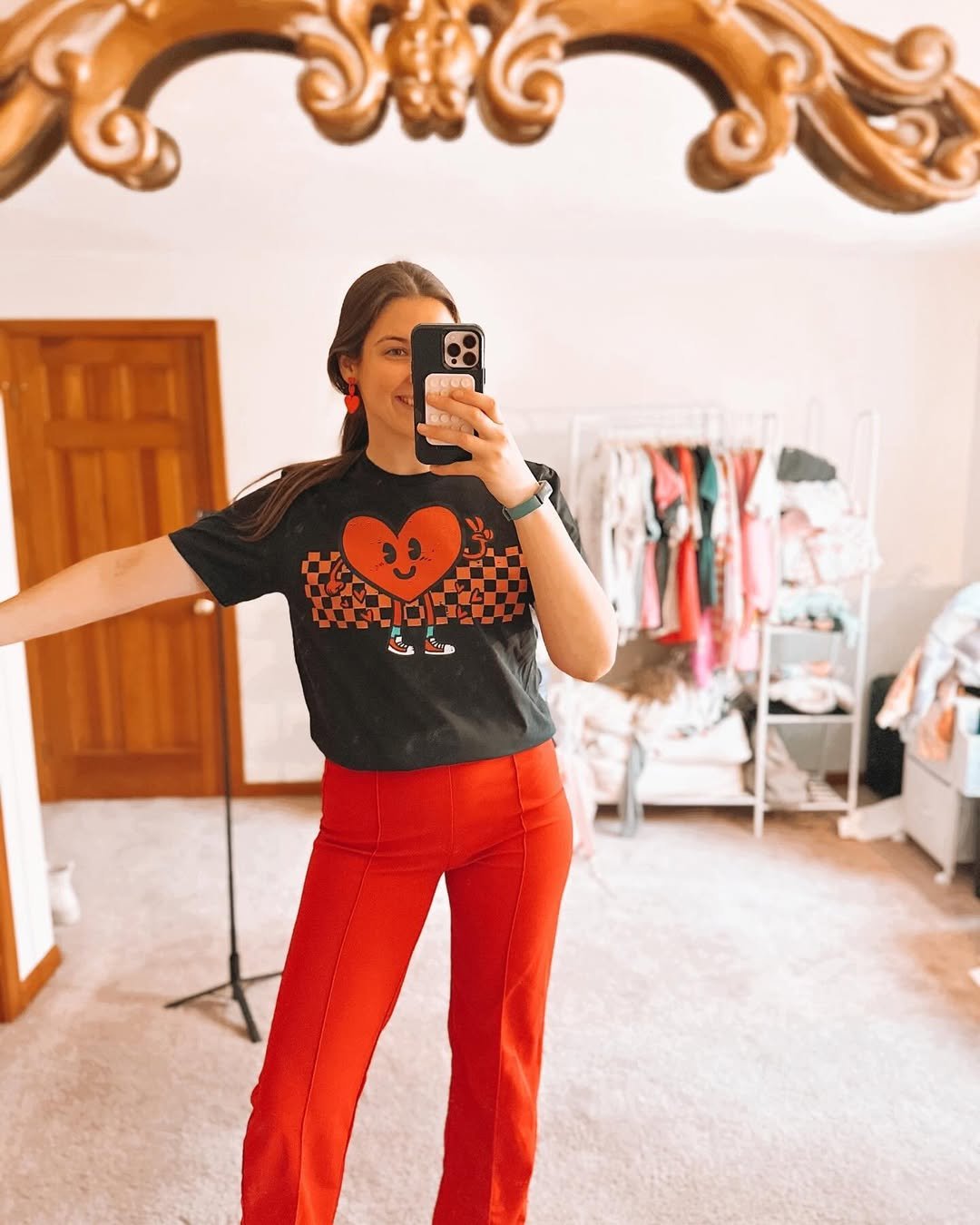 This look feels like Valentine’s Day without the pressure. The black graphic tee with a bold red heart instantly sets the mood, while the bright red pants add that playful pop that makes it feel intentional, not thrown together.