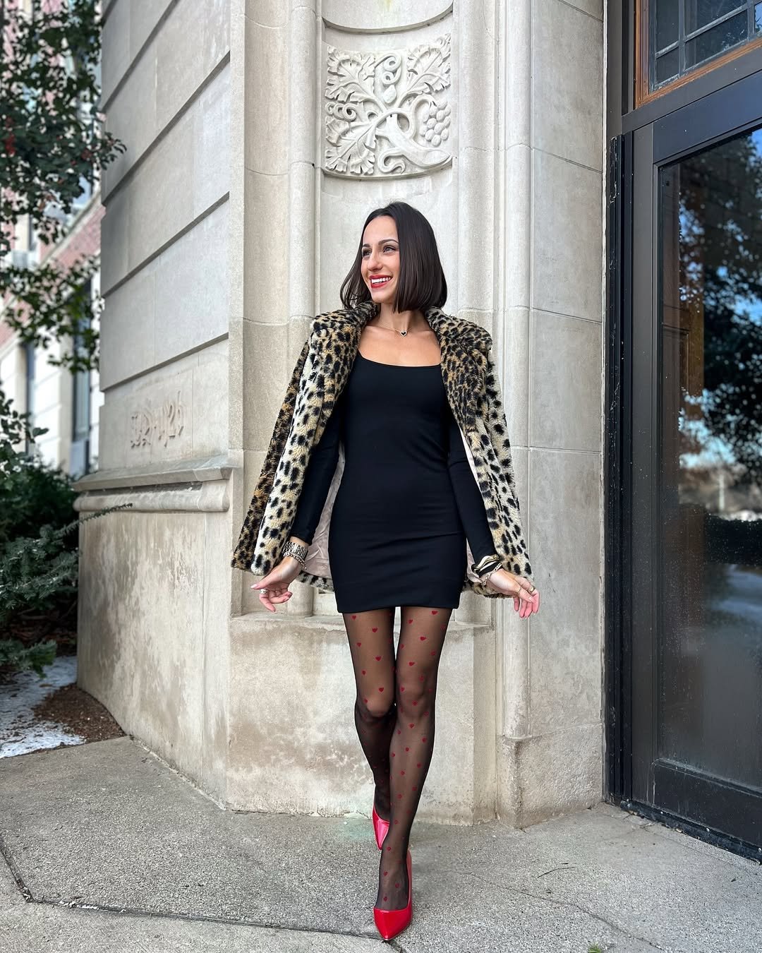 This look is all about confidence. A sleek black mini dress paired with heart-print tights and a leopard coat feels bold, fun, and undeniably chic.