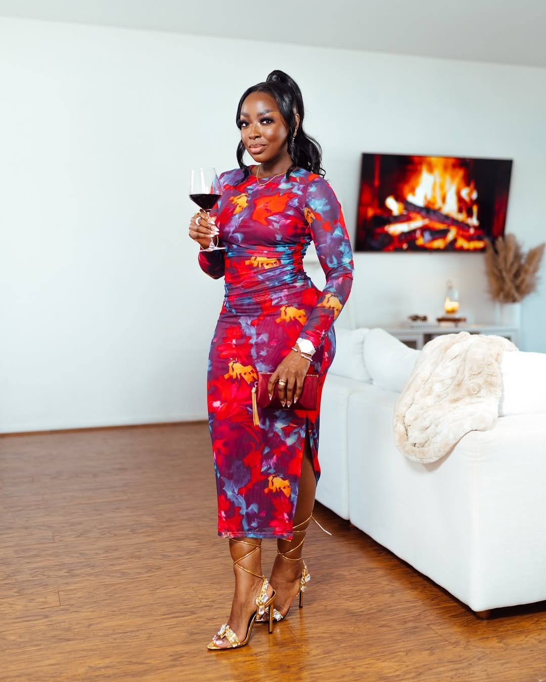 This look feels luxe and intentional, with deep floral tones that read romantic without leaning predictable. The fitted silhouette and slit add just enough drama, while the print keeps it artistic and refined.