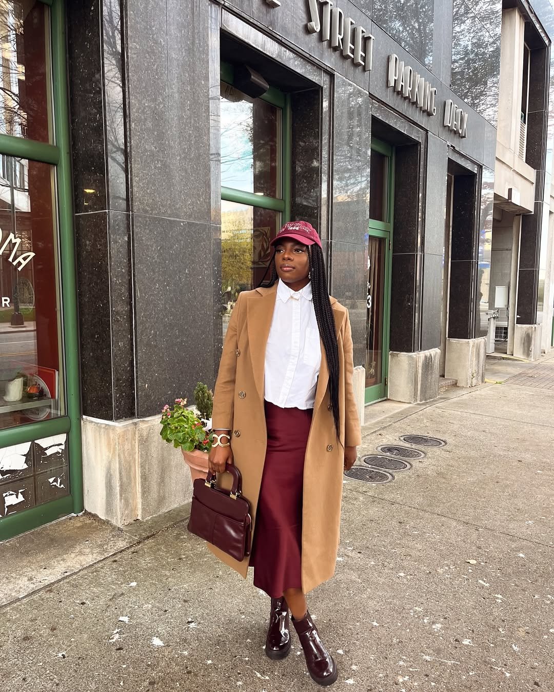 This look feels effortlessly put-together. A camel coat layered over a crisp white shirt and deep burgundy skirt creates a rich, romantic palette without leaning obvious.