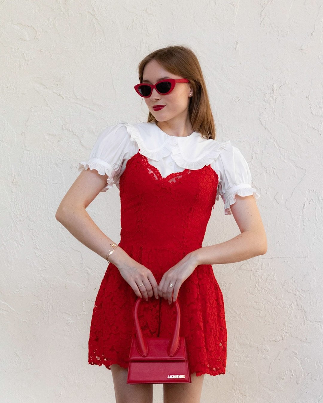 This look feels like a love letter to vintage romance. The rich red lace layered over a crisp white blouse brings that playful contrast that feels intentional, not costume-y. Add the red sunnies and structured mini bag, and suddenly it’s flirty with a wink.