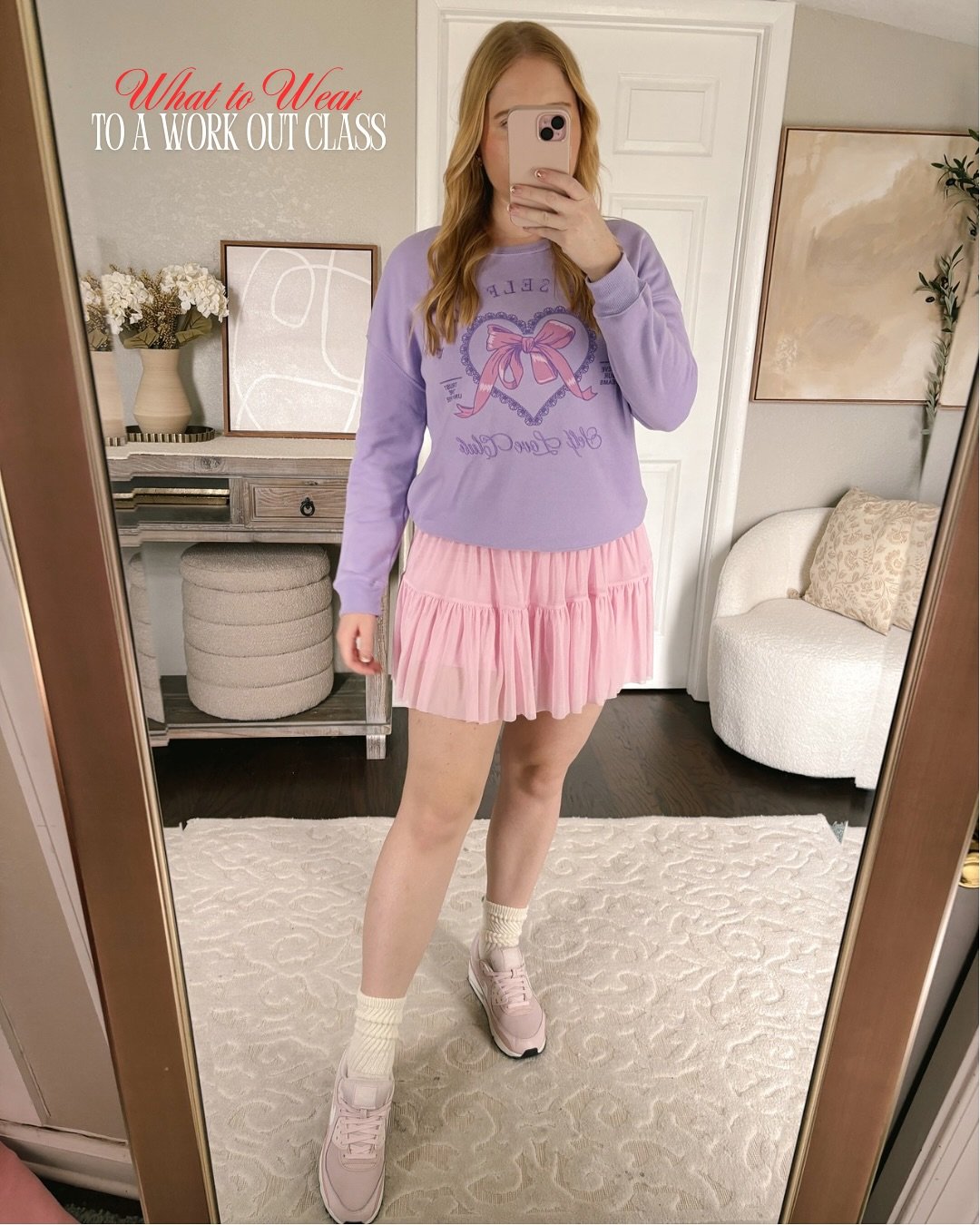 This lavender sweatshirt paired with a blush skirt feels light, sweet, and very wearable. The mix of casual and feminine keeps it from feeling too precious.
