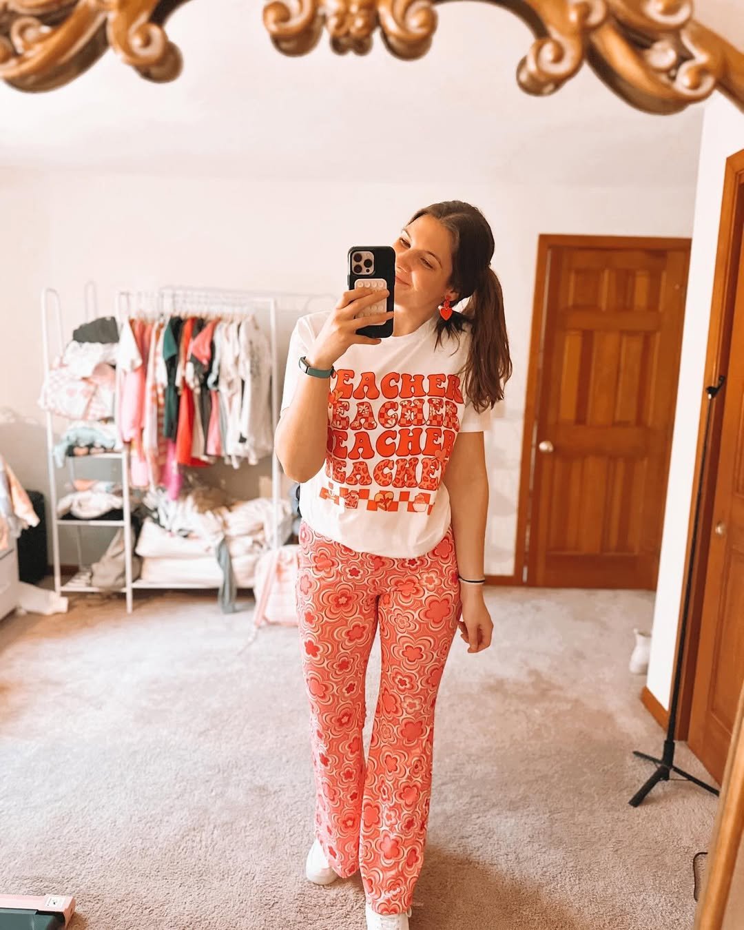 This outfit leans fully into cozy Valentine energy. The white graphic tee paired with heart-print pants feels fun, relaxed, and very wearable — like you’re celebrating the day, but on your own terms.