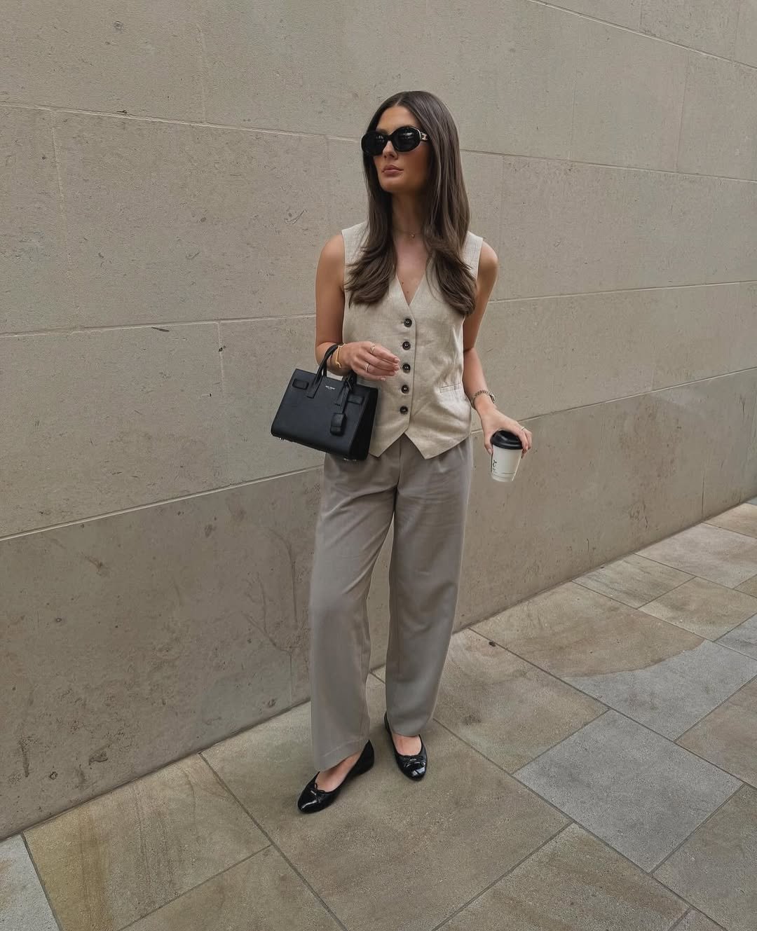 This look leans clean and contemporary. A vest styled with wide-leg trousers feels strong and effortless, especially in a soft, neutral tone.
