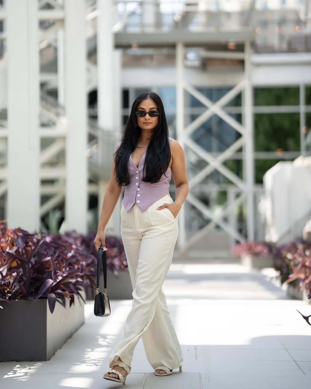This look is all about relaxed confidence. The lilac vest feels fresh and feminine, especially paired with creamy wide-leg trousers that move beautifully as you walk. It’s tailored, but not stiff, which makes it perfect for warm days when you still want structure.