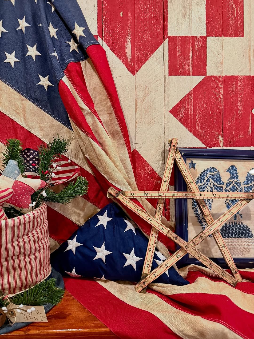 This setup leans into nostalgia in the boldest way. Faded flags, weathered wood, and stitched details stack into a scene that feels like a summer porch wrapped in history.