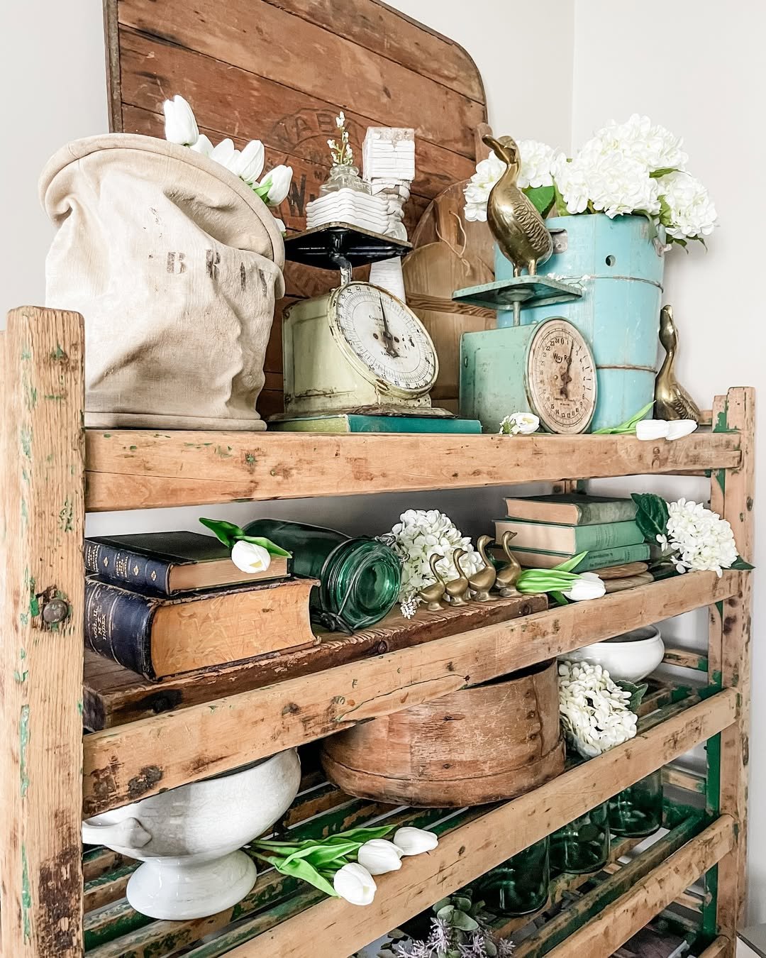 There’s a quiet elegance in how this shelf is built up. Old scales, stacked books, and soft white florals create a palette that feels fresh but grounded in history. The worn wood shelving adds warmth, balancing out the lighter pieces.