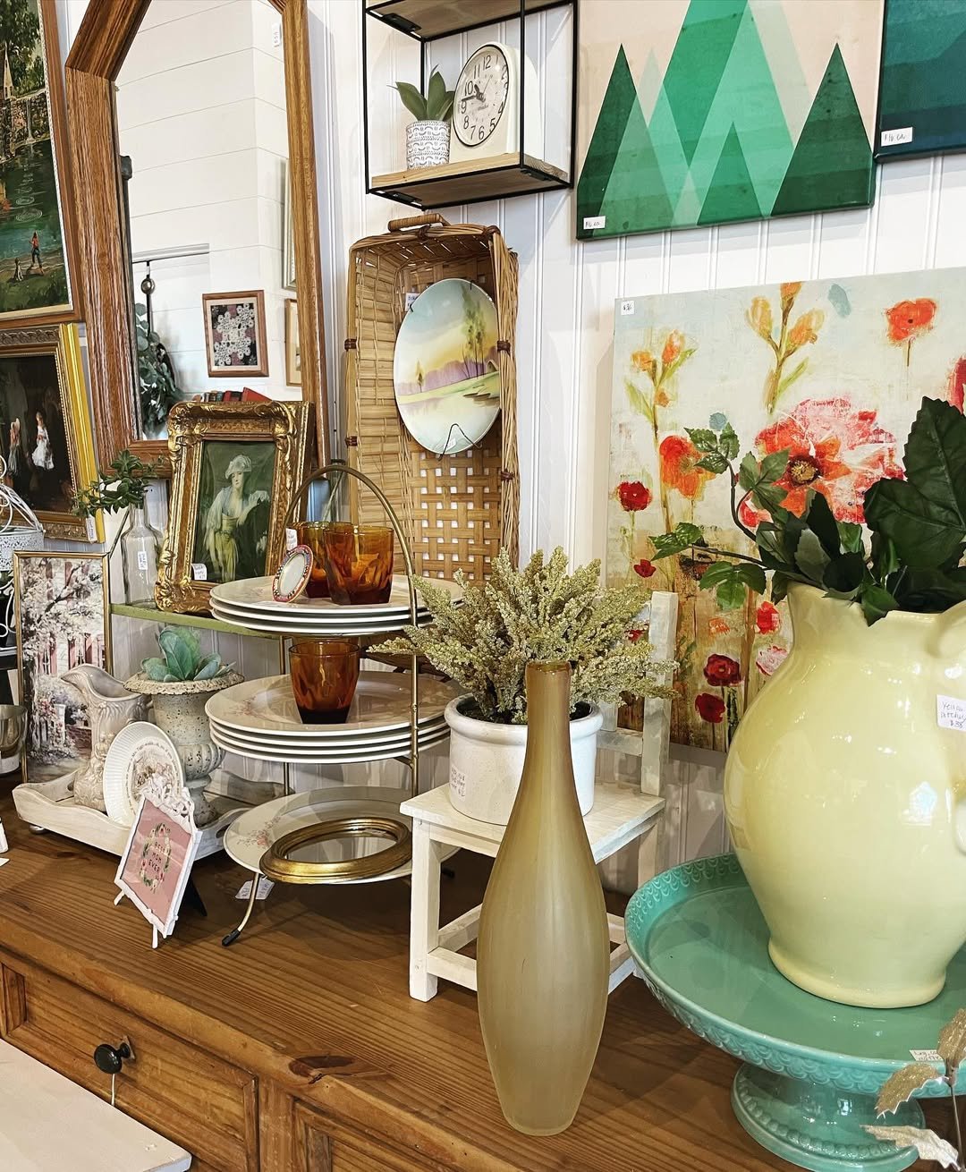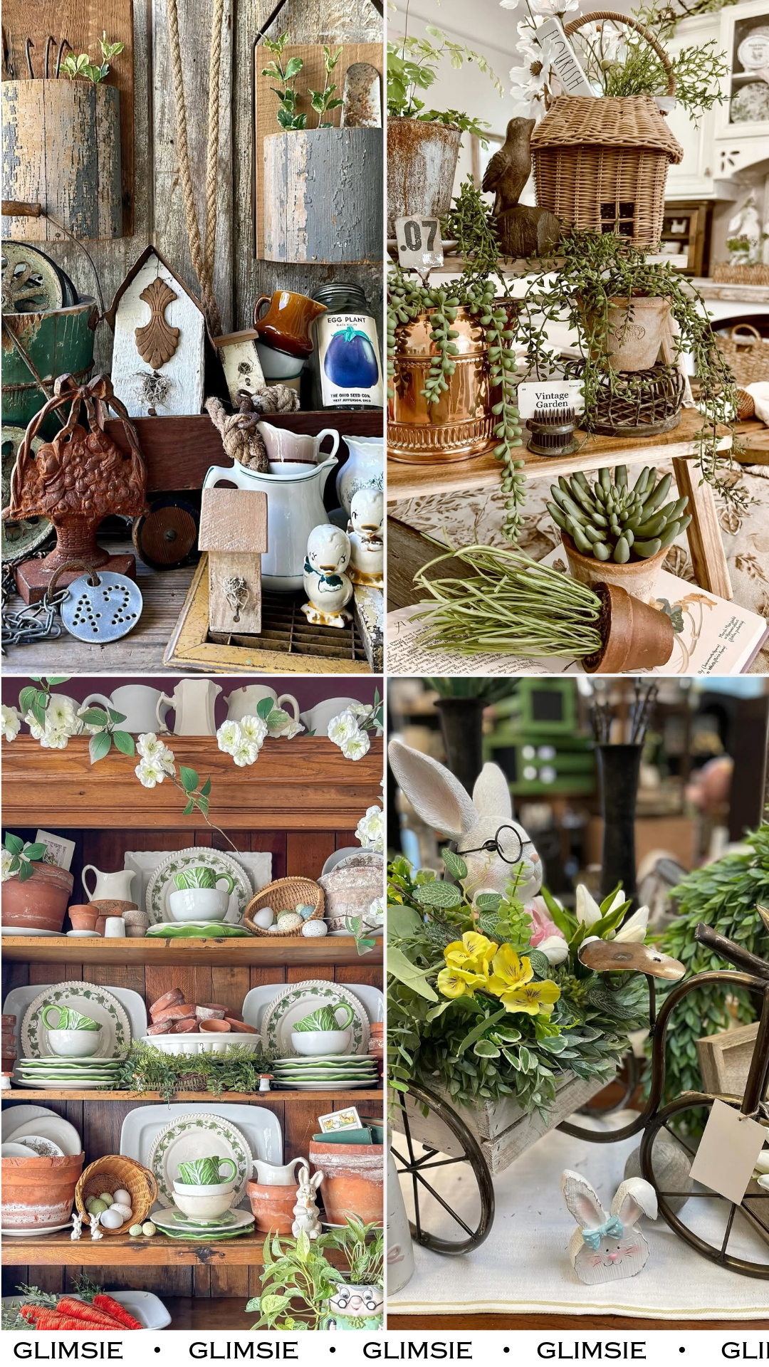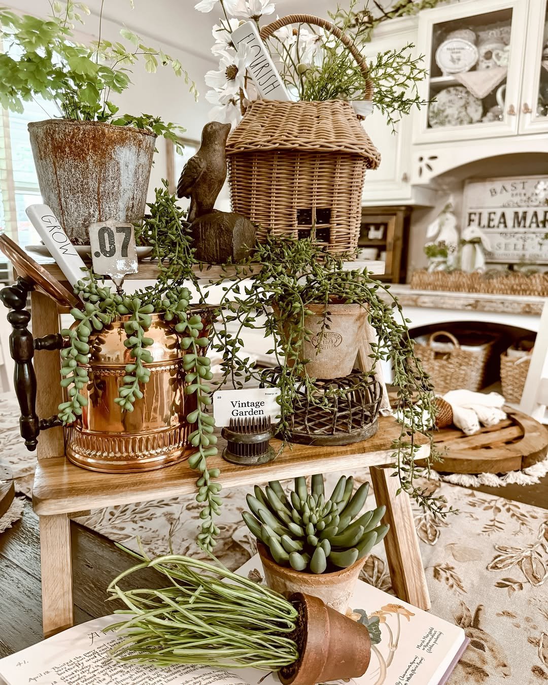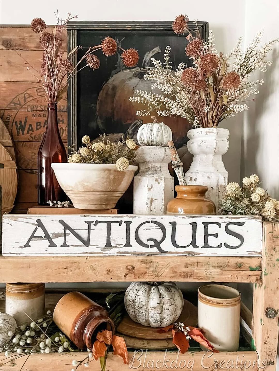 There’s a softness here that leans almost romantic. Faded florals, aged wood, and a simple “antiques” sign anchor the display while dried stems add a gentle movement.