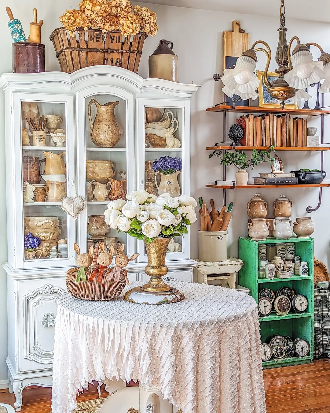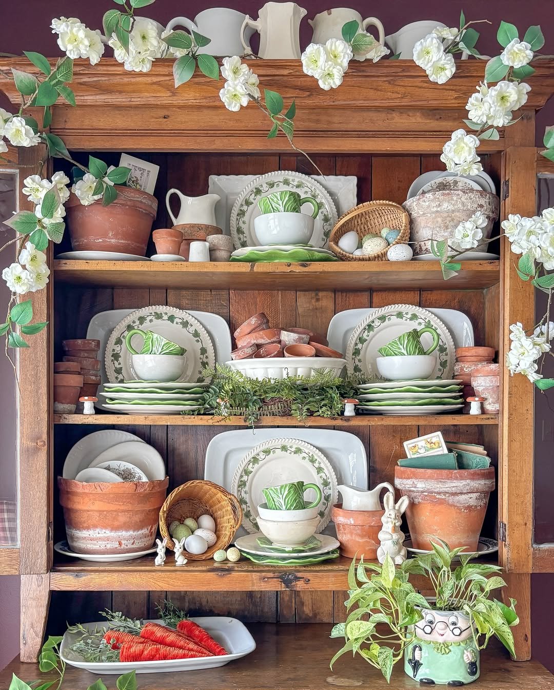 This hutch feels like spring has quietly taken over. Terra cotta pots, leafy greens, and soft white dishes stack in a way that feels both fresh and rooted.