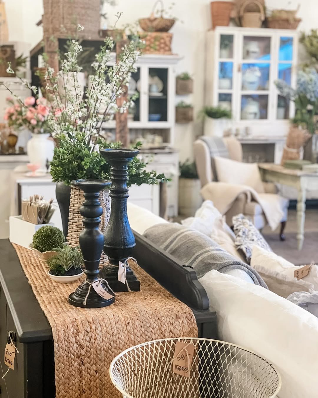 This space leans into comfort in the most effortless way. A woven runner, dark candlesticks, and soft greenery create a layered look that feels calm and inviting, like a quiet Sunday afternoon at home.