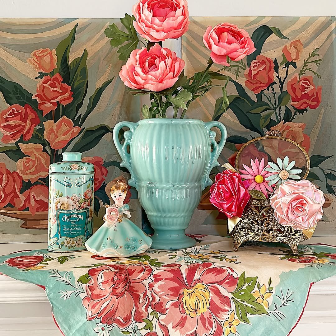 This setup feels almost like a painting brought to life. A soft teal vase, layered florals, and delicate vintage accents sit against a richly patterned backdrop that adds depth and warmth.