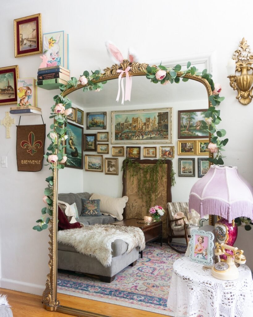 This corner feels whimsical in the most charming way. A gold mirror draped with greenery and soft florals reflects a gallery wall that adds layers of personality and history.