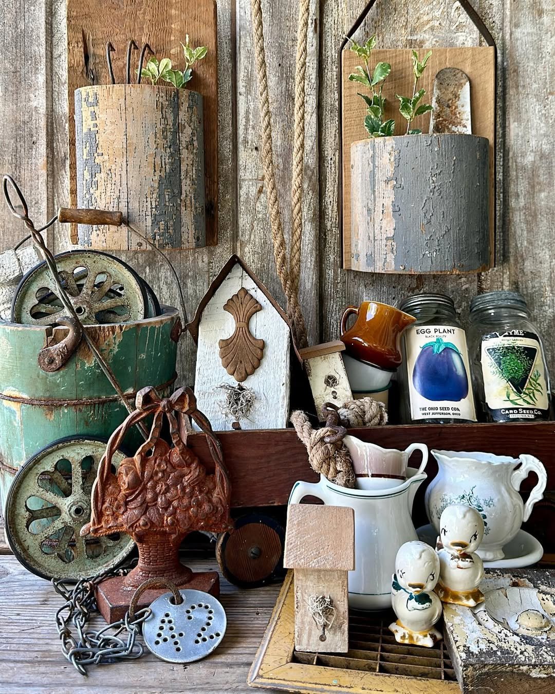 This vignette feels like stepping into an old potting shed where everything has a story. Weathered wood, chipped paint, and timeworn metal tools come together in a way that feels collected, not styled. Even the smallest details, like seed packets and worn pitchers, add to that layered, tactile charm.