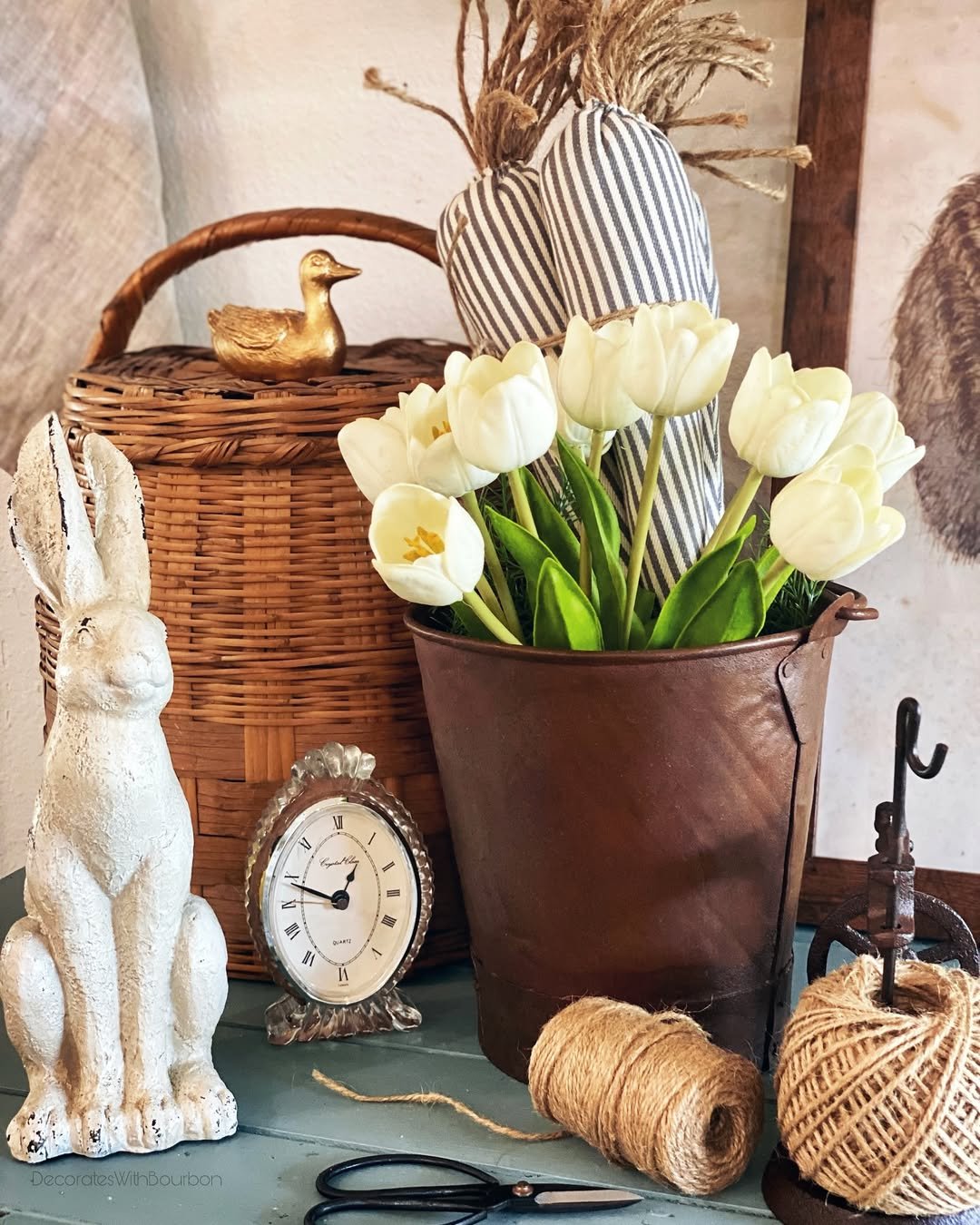 A small vignette, but full of charm. White tulips in a rustic metal container, paired with a few vintage accents, create a look that feels fresh without trying too hard.