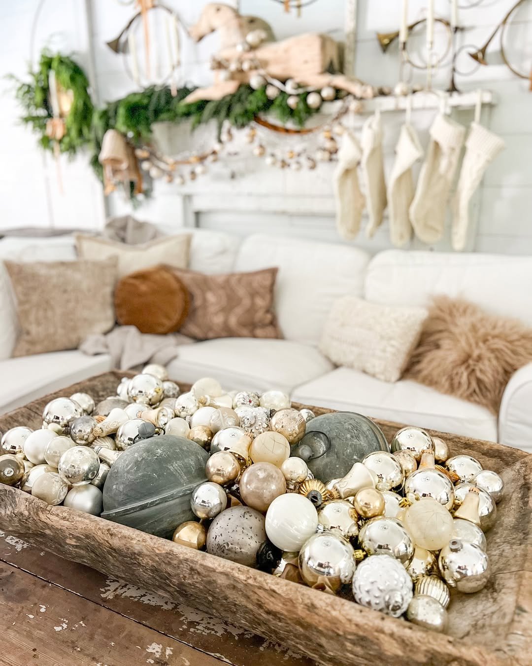 A room that whispers instead of shouts. Creamy textiles, soft wood tones, and a bowl of vintage ornaments create a look that feels calm, almost like a deep exhale.
