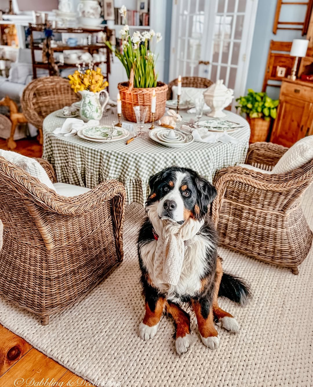 This setting feels instantly welcoming, and not just because of the sweetest four-legged guest. Wicker chairs, soft textiles, and a simple floral centerpiece create a space that feels ready for a slow brunch.